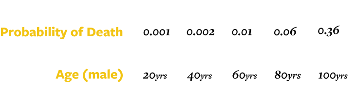 For example, a 20-year-old man has 99.9 percent chance of living to see his 21st birthday. This is to say that his chance of dying is 1 in 1,000 per year. If this were to continue, then a 40-year-old would also have a 1 in 1,000 chance of dying before his 41st birthday. We’d call that “no aging.” In reality, a 40-year-old has a 2 in 1,000 chance of dying before his 41st birthday. This doubling of his mortality risk over 20 years is evidence of gradual aging.