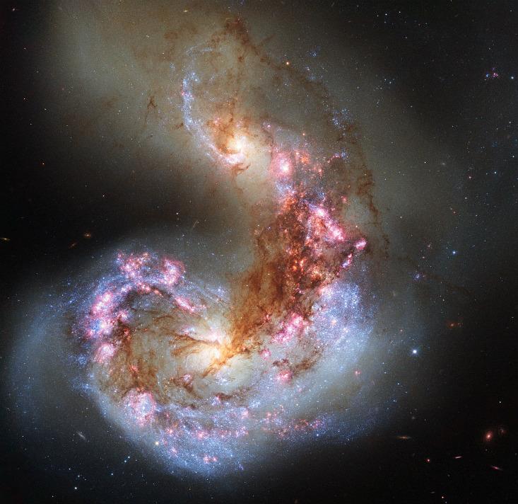 One long-standing puzzle in the study of star formation is the existence of “starbursts”: the dramatic appearance of groups of stars in the region where two galaxies collide. According to the simple model of star formation, turbulent vortexes formed by the collision should interfere with the gradual collapse of gas clouds, preventing them from forming stars. Judging by the beautiful images seen of starbursts—as in the Antennae Galaxies above—there was obviously something missing from that model.