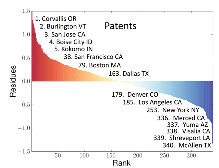 My colleagues Luis, José, and Debbie carried out such an analysis for the entire United States urban system consisting of 360 Metropolitan Statistical Areas (MSAs) for a suite of metrics.3 A sample of the results is presented in Innovation in Cities (above), where the deviations from scaling for personal income and patent production for cities in the U.S. in 2003 are plotted logarithmically on the vertical axis against the rank order of each city. We called these deviations Scale-Adjusted Metropolitan Indicators (SAMIs). The horizontal axis across the center of these graphs is the line along which the SAMI is zero and there is no deviation from what is predicted from the size of the city. As can be seen, every city deviates to some extent from its expected values. Those to the left denote above-average performance, whereas those to the right denote below-average performance. This provides a meaningful ranking of a city’s individuality and uniqueness beyond what is effectively guaranteed just because it’s a city of a certain size. Without delving into details of this analysis, I want to make a few salient points about some of the results.