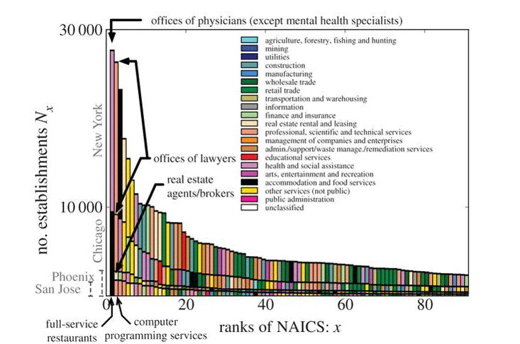 It’s obvious why lawyers and restaurants would rank high in New York, but what is it about New York that there should be such a large abundance of doctors? Is life in the Big Apple that stressful and unhealthy? If you find this intriguing, you can see the analogous decomposition of economic activities in your favorite city in the supplementary material to our paper posted on the Web. Clearly, for those running a city or thinking about its future or investing in its development, knowing these sorts of details about the composition of their business landscape provides an important input.