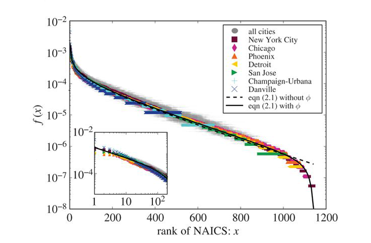 What is particularly satisfying is that this unexpected universality, as well as the actual form of the universal curve and the logarithmic scaling of diversity, can all be derived from theory. The universality is driven by the constraint that the sum total of all the different businesses in a city scales linearly with population size, regardless of the detailed composition of business types or of the city. The snakelike mathematical form of the actual distribution function in the chart can be understood from a variant of a very general dynamical mechanism that has been successfully used for understanding rank-size distributions in many different areas, ranging from words and genes to species and cities. It goes under many different names including preferential attachment, cumulative advantage, the rich get richer, or the Yule-Simon process. It is based on a positive feedback mechanism in which new elements of the system (business types in this case) are added with a probability proportional to the abundances of how many are already there. The more there are, the more of that type are going to be added, so more frequent types get even more abundant with increasingly higher probability than less frequent types.5, 6, 7