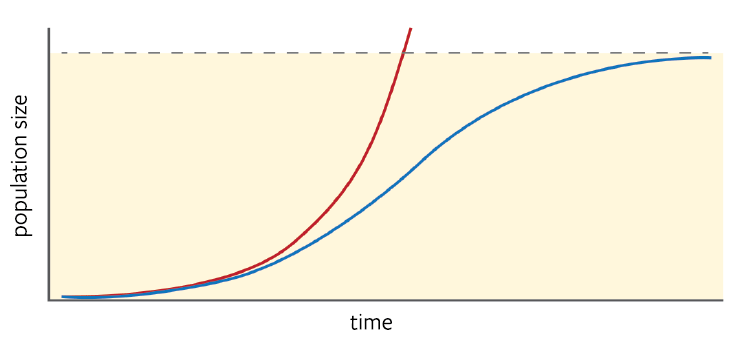 In this model, which Verhulst called the logistic function, K is the carrying capacity. At first, growth accelerates, as Malthus had assumed. But as N (population size) approaches K, growth slows to a crawl before stopping at its limit.