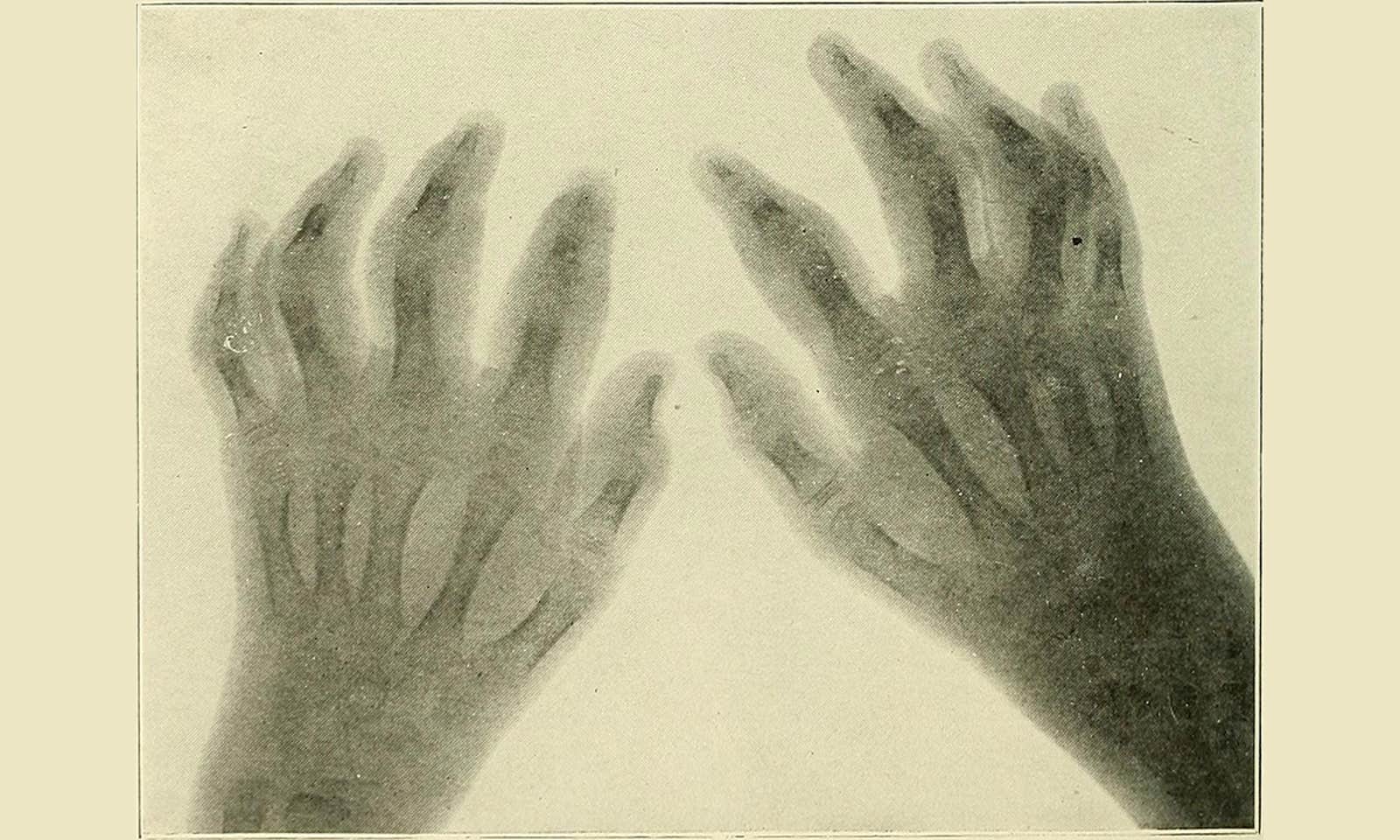 Not long after his initial X-ray experiments, Röntgen learned that his rays could travel through human tissue to illuminate the bones within. He captured the bones in the hand of his wife, Anna Bertha Ludwig. “I have seen my death,” she said at the time. Röntgen noticed that the skin around her bones had a fainter shadow because it was more permeable to the rays