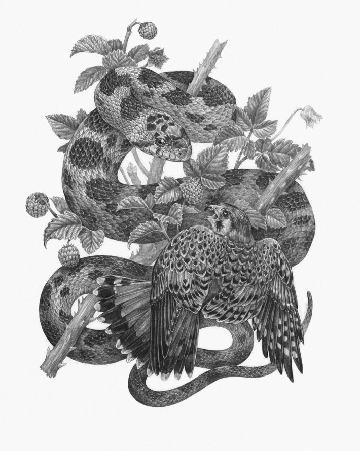 I like to start off very loosely, planning out the drawing in its entirety and ironing out the composition as much as I can. I work the entire piece for a while, to make sure that I understand where the darkest values are going to be. The final pass takes the longest. I usually work from the top left corner to the bottom right, laying in the textural details. It’s really important as I work to keep an eye on the piece as a whole, to make sure that all of the elements remain balanced.
