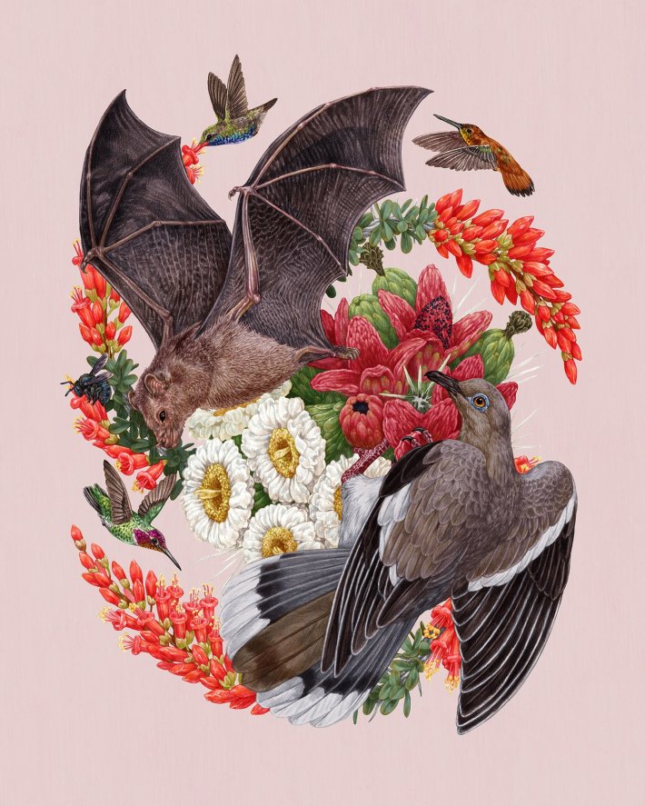 My time reading about species is honestly my favorite part of my entire process! I love having an excuse to deepen my understanding of a familiar species, or to live vicariously through a scientist who has studied a species I will never see in person. My more complex compositions highlight species life cycles, predator-prey relationships, symbiotic relationships, and mating rituals: things that are not obvious to me as an amateur naturalist. Often, my initial idea for a piece will change completely after I’ve had the opportunity to look through a few journal articles.